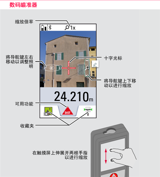 徠卡DISTO?D810 是世界上唯一一款帶圖像測量的手持激光測距儀。它在不靠近目標的情況下,調節D810 touch屏幕上的圖像光標就可以進行遠程測量。圖像測量可以直接測量目標的,長度、寬度、面積、直徑、周長等。徠卡DISTO?D810具有高精度羅盤、舒適的彩色觸摸屏、四倍數碼瞄準器、清晰的數碼照相功能、鋰電池充電、新一代藍牙4.0、徠卡Sketch軟件等諸多優勢。這些功能讓測距儀不再是個工具而是儀器。